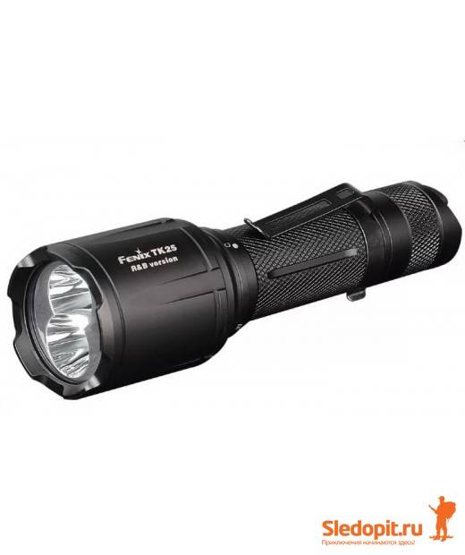 Компания Fenix не прекращает выпускать новые модели качественных и удобных в применении фонарей. Производители предлагают воспользоваться тактическим TK25RB, оборудованным сразу двумя светодиодами. Один из диодов работает исключительно с белым светом, поддерживая четыре уровня яркости и дополнительный режим стробоскопа. Максимально доступная для него яркость света равна 1000 люмен. При этом, диод прослужит дольше, чем 50 000 часов. Второй же диод способен работать сразу с красным и синим светом, поддерживая еще три режима. Его долговечность такая же, как и у первого. Производители привели данные, характерные для каждого из режимов при условии того, что в фонарь установлен фирменный аккумулятор емкостью 3500 мАч: