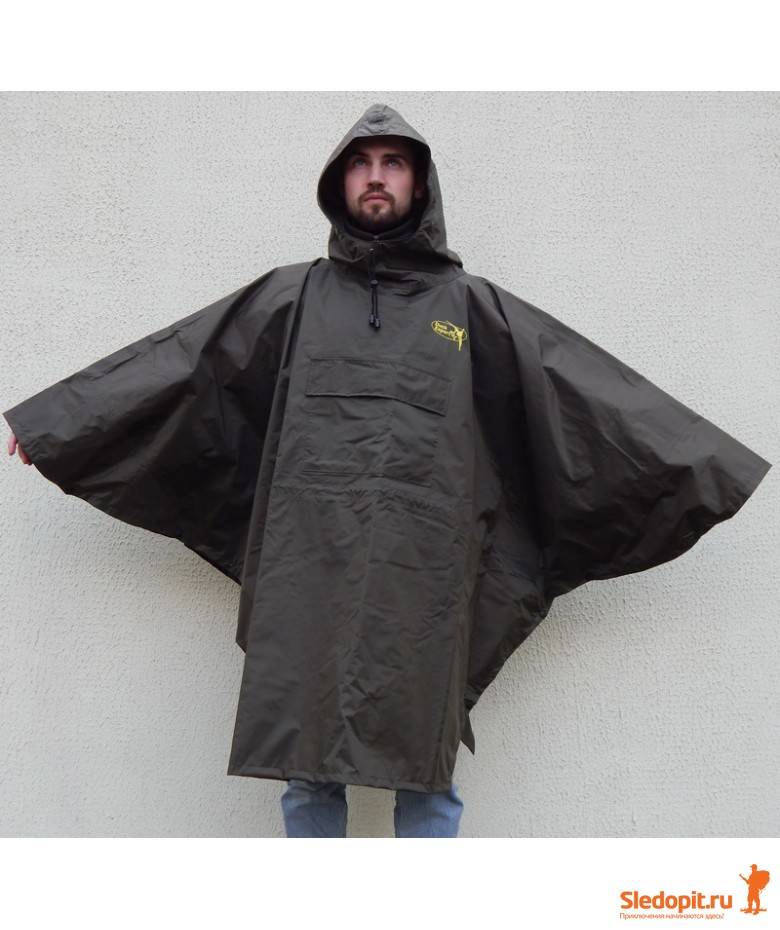Пончо имеет капюшон и наружний карман на груди. Низ и "рукава" пончо защелкиваеюся на металлические кнопки защищая как от влаги, так и от холодного ветра.