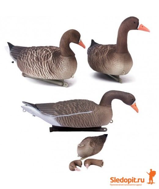 Чучела гусей имеют съемные поворотные головы благодаря чему каждому чучелу можно придать индивидуальную позу, что значительно повышает реалистичность по стравнению со стандартными литыми чучелми в стандартных позах.