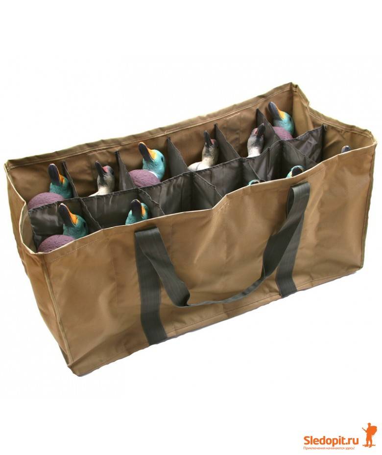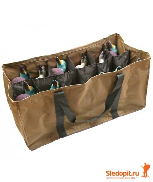 Сумка имеет 12 ячеек для утиных чучел куда без труда помещаются 12 стандартных пластиковых чучел уток разных производителей, либо 24 чучела со съемной головой из полистирола DUCK MAGNIT