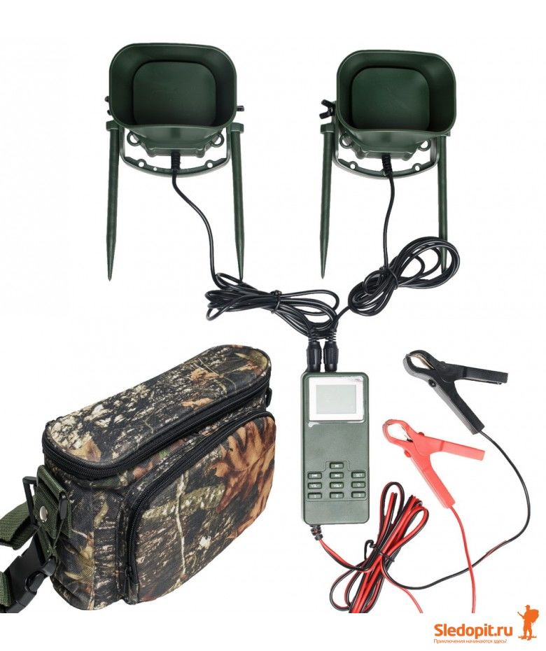 Комплект поставки состоит из манка и двух внешних динамиков мощностью 50W, что позволяет не только добиться реально мощного и качественного звука суммарной мощностью в 100W, но также дает возможность направить динамики в разные стороны увеличив таким образом площадь действия манка. Манок и динамики выполнены в пластиковом корпусе и имеют стандартную для манков зеленую расцветку. Коллекция голосов к новому 2020 сезону была обновлена и теперь является еще более эффективной.