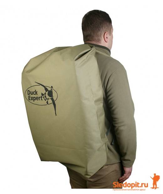 Прочный, надежный, большой и удобный чехол-рюкзак предназначен для переноски во время охоты, хранения в межсезонье или транспортировки в автомобиле лежачих засидок Duck Expert Профи или Хантер. Не секрет, что после охоты на весенних или осенних раскисших полях, где много грязи, а также на болотах, в условиях когда идут дожди мокрая и грязная засидка может во время транспортировки выпачкать как одежду, так и салон автомобиля и другое снаряжение. Чтобы этого избежать был разработан специальный чехол-рюкзак в который быстро и удобно помещается засидка и при этом дополнительно еще может быть уложено некоторое снаряжение. Также данный чехол может применяться для переноски и хранения чучел гусей на охоте, либо любого другого снаряжения.