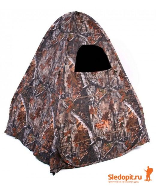 Уникальная конструкция палатки, основанная на гибком каркасе, позволяет за считанные минуты установить данное укрытие, которое позволяет быть Вам невидимым для зверя и птицы, уберечься от ветра и осадков, вести наблюдение за объектом охоты через окна-бойницы. Конструкция в виде палатки позволяет надежно укрыться от глаз осторожного весеннего селезня или не менее осторожных гусей, которые часто неожиданно налетают сзади и охотник их не видит, либо совершают несколько круговых облетов и крайне важно, чтобы охотник в этой ситуации был замаскирован на 360 градусов.