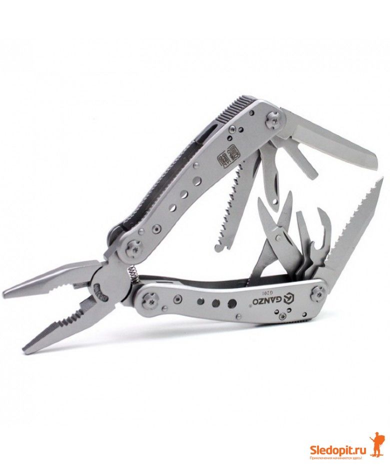 Мультитул Ganzo G201 представляет из себя практичный инструмент для ремонта любого снаряжения или даже техники в походных условиях. Он довольно компактный и легкий (265 грамм), чтобы его было удобно брать с собою в поездки. В то же время, Ganzo G201 успешно справляется с 22 различными функциями. Главный инструмент в данной модели — плоскогубцы с кусачками и держателем круглых предметов. Остальные элементы представляют собою компактные инструменты, размещенные внутри рукояток, наподобие швейцарского ножа. Это ножи с гладкой и серрейторной заточкой, пила, открывалка для консервов, ножницы, шило, две небольшие плоские отвертки. Помимо того, большой набор сменных наконечников для отвертки вынесен в отдельный органайзер. Они закрепляются на держателе мультитула при помощи магнитного переходника.