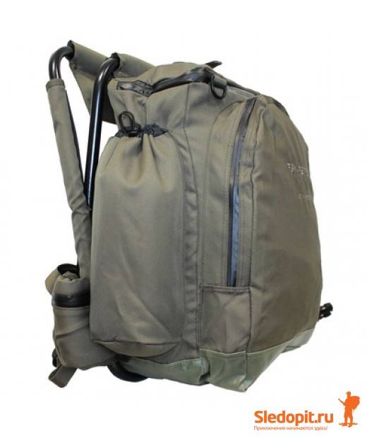 Легкий стул складывается на задней части рюкзака и крепится к рюкзаку эластичными ремнями на застежках. При необходимости снимается и становится отдельным предметом. Наплечные ремни удобны и комфортны, при необходимости регулируются по длине при помощи пряжек. Поясной ремень снабжен небольшим карманом для сотового телефона. Мягкая ручка сверху позволит нести рюкзак в руке и вешать его на крючок, ветку.