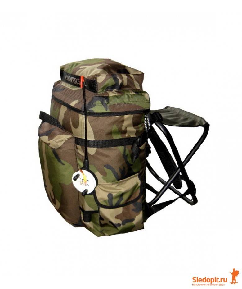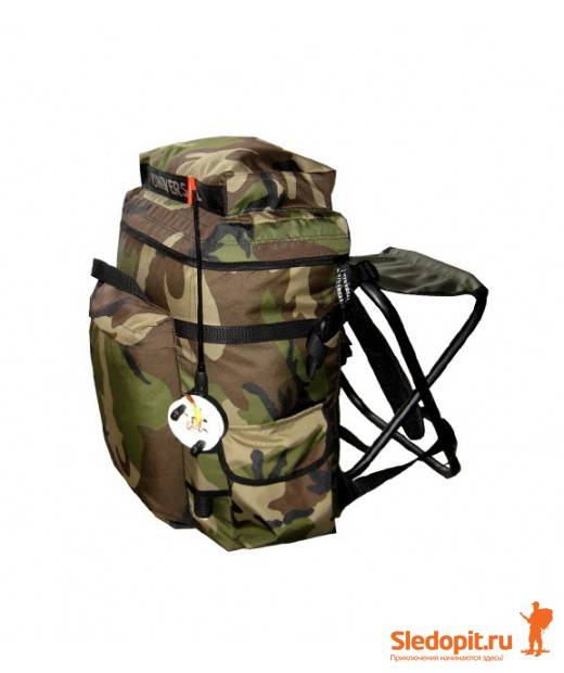 Крышка рюкзака закрывается на молнию, складной стульчик легко крепится к спине рюкзака.