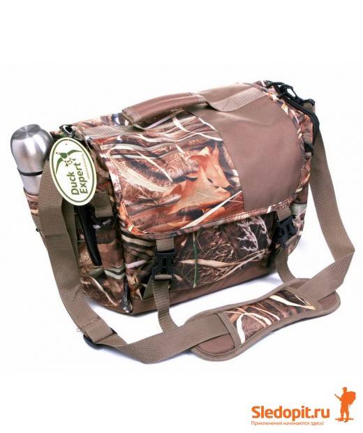 Сумку можно переносить в руке (сверху сумки есть удобная ручка) или через плечо на удобном регулируемом по длине ремне. Сумка сверху закрывается клапаном с прочными застежками фастекс. С внутренней стороны клапана размещены два сетчатых кармана на молнии. Под клапаном сумки расположено главное отделение, которое закрывается на двойную молнию. Внутри основного отделения в котором удобно размещаются как коробки с патронами, так и при необходимости термос имеются два больших сетчатых кармана, большой сетчатый карман на молнии и 4 тканевых высоких кармана для мелочей.
