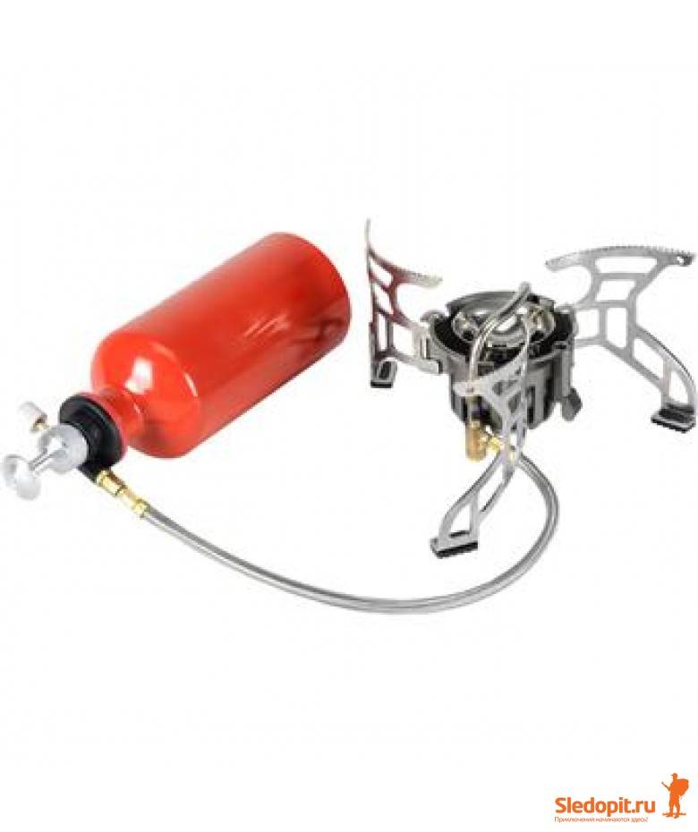 - В комплекте: горелка, емкость для жидкого топлива (500 мл), насос для жидкого топлива, переходник для газового баллона, тканевый чехол, инструкция по эксплуатации