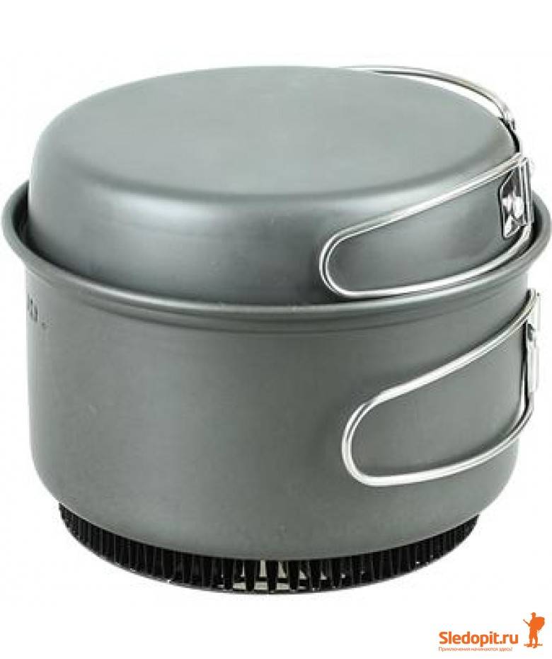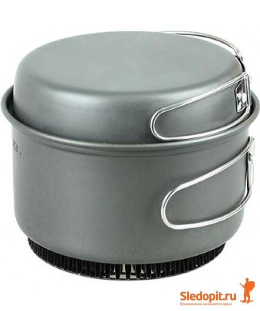 Кастрюля объемом 1400мл с плотно прилегающей крышкой и складывающимися ручками. Крышка кастрюли также оснащена ручками и являет собой полноценную сковородку. Наличие радиаторного кольца на кастрюле значительно ускоряет процесс закипания и экономит топливо. Силиконовая прихватка поможет не обжечь руки.