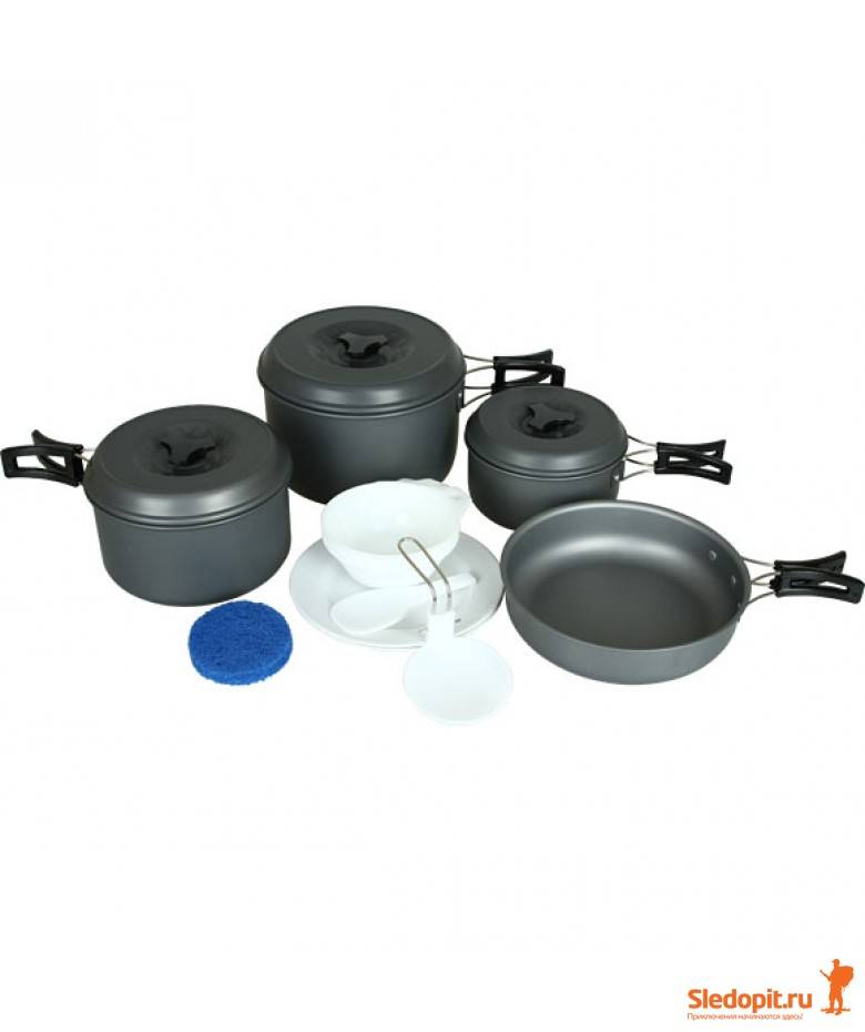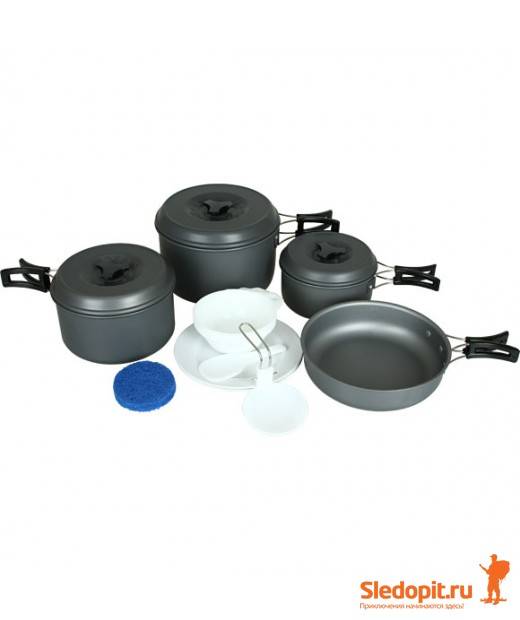 Кроме металлической посуды в комплект входят изготовленные из полипропилена складной половник, ложка-лопатка, две плоских, а также пять глубоких тарелок, которые при необходимости, могут служить и кружками.