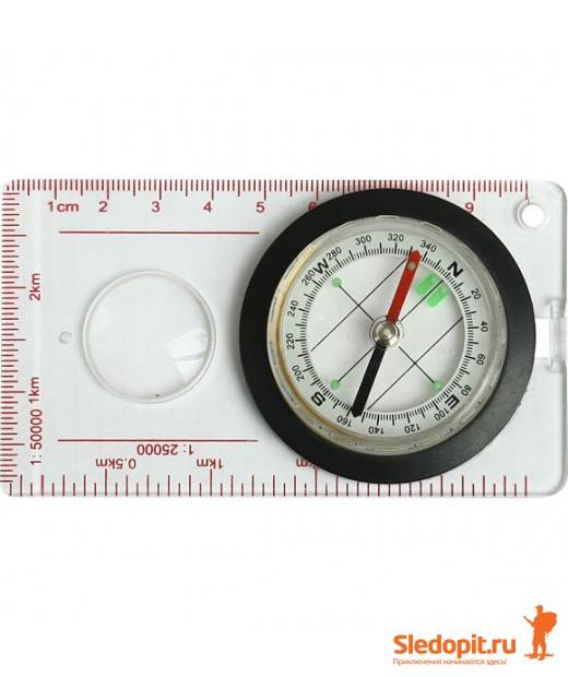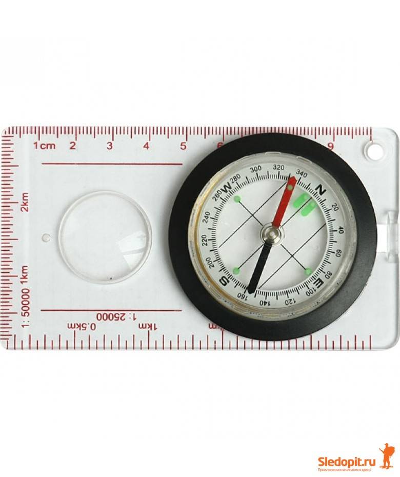 Планшетный компас со стабилизирующей жидкостью. Представляет собой компас, линейки для карт: простая и масштабная, увеличительное стекло, шнурок для ношения на шее